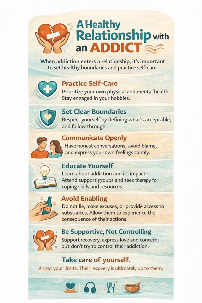 Understanding addiction and the recovery process will help you communicate more effectively and empathize with the challenges the individual is facing. Educating yourself about recovery can provide a more informed perspective, helping you navigate the relationship with greater sensitivity and understanding.