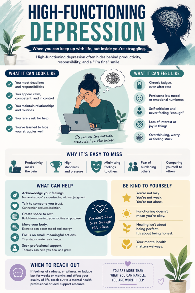 High-functioning depression is often hidden behind competence. People who experience it may be high achievers, caregivers, or individuals who’ve learned to push through discomfort.