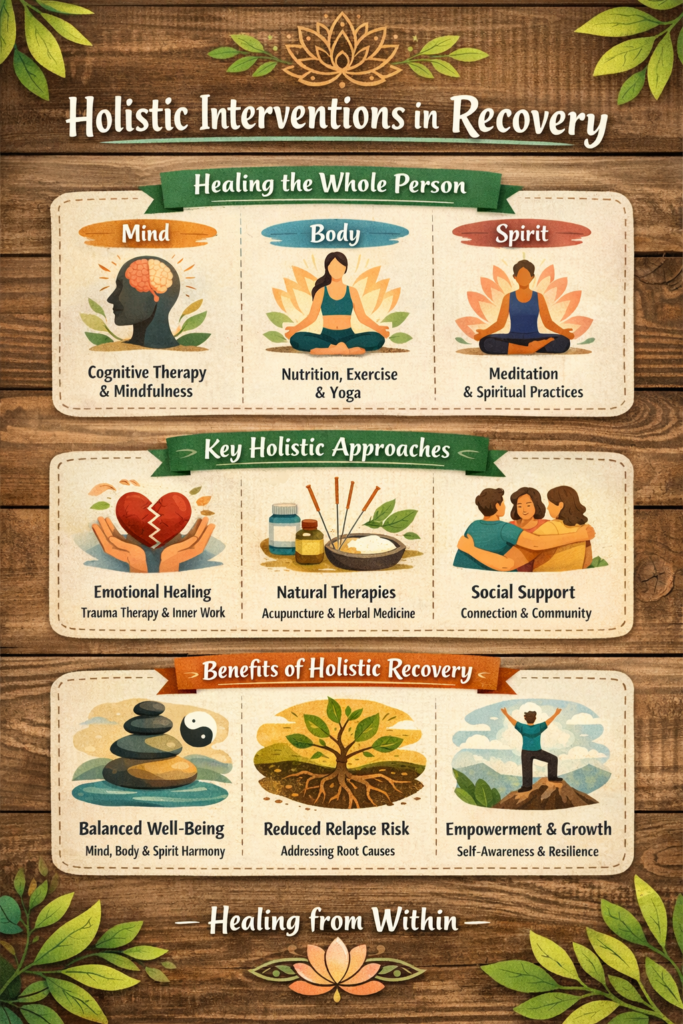 Holistic interventions look at all parts of a person’s life: body, mind, emotions, and environment. Instead of only treating the physical side of addiction, these approaches recognize how things like mental health, lifestyle habits, relationships, and sense of purpose play into staying sober. Many people find this approach more human and supportive because it meets them where they are—not just focusing on symptoms, but on the underlying factors in their everyday lives.