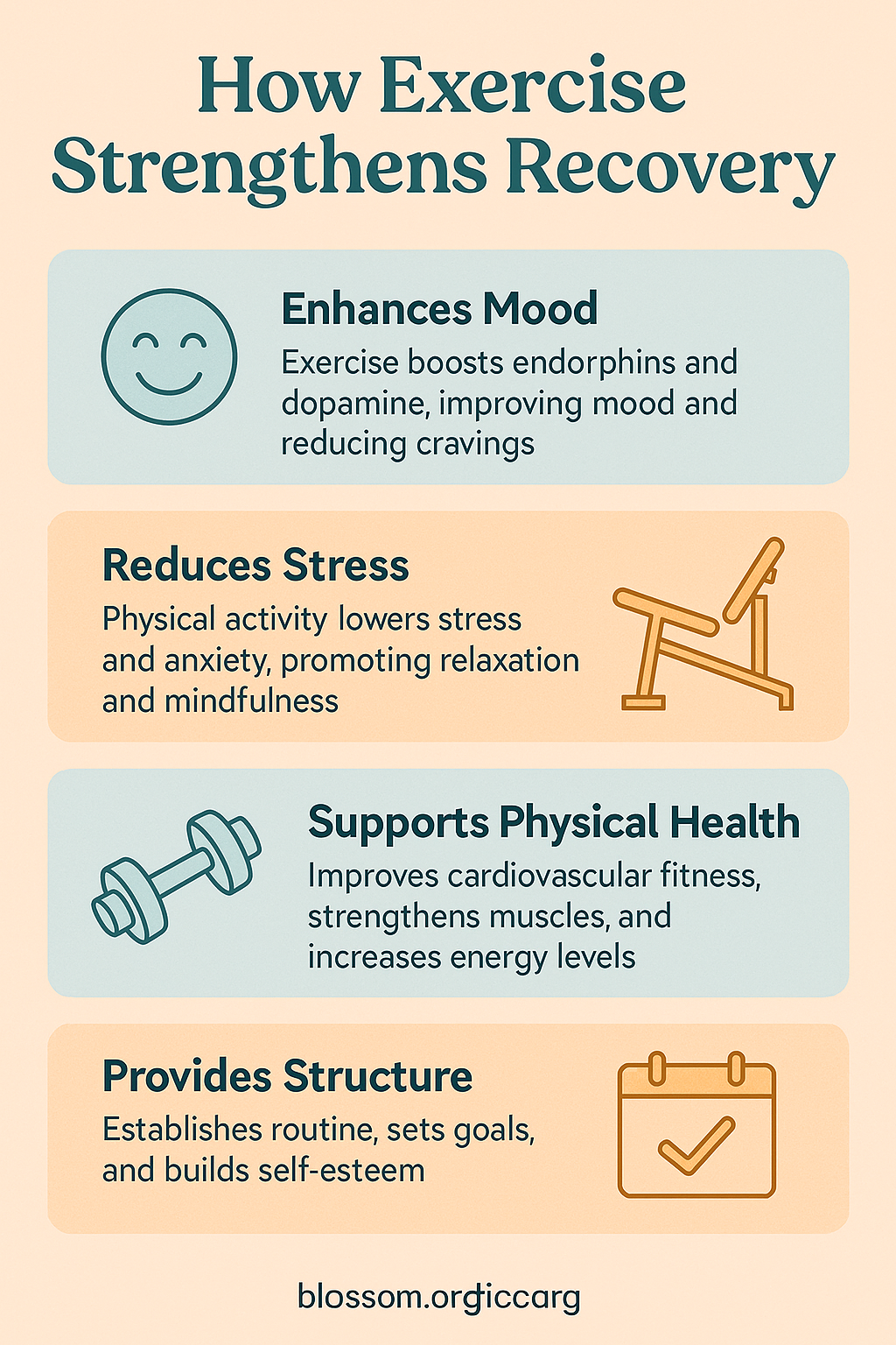 - Mental Clarity: Physical activity improves cognitive function and mental clarity, leading to better decision-making, enhanced focus, and improved coping strategies during recovery.