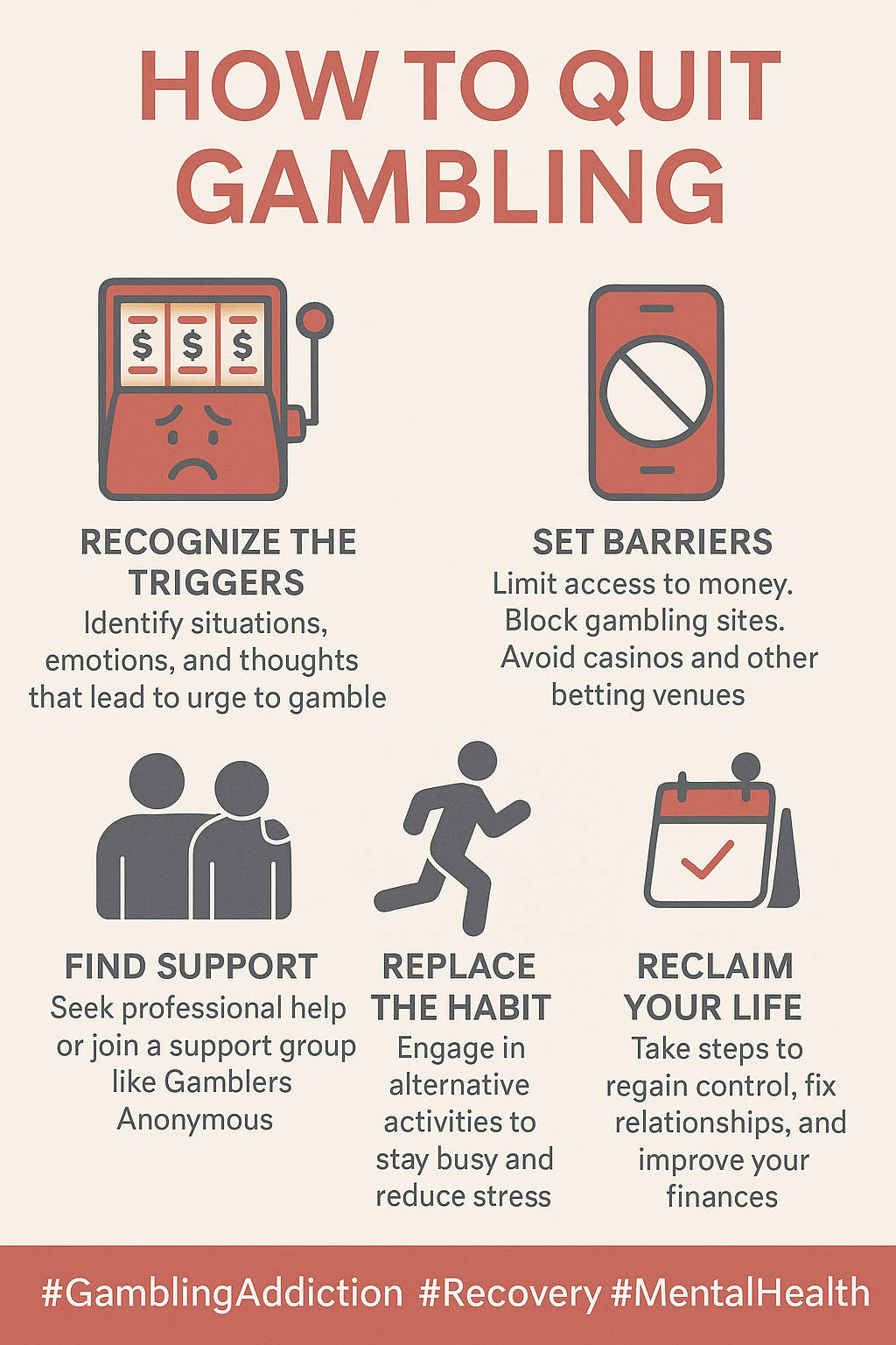 Often, gambling sneaks into your routine before you even notice its adverse effects. Financial losses, strained relationships, and persistent stress show that change is needed. The process of quitting gambling involves a mix of self-reflection, planning, and the willingness to adopt new habits. With a thoughtful approach and the right support system, you can slowly overcome the urge to gamble and rebuild your life.