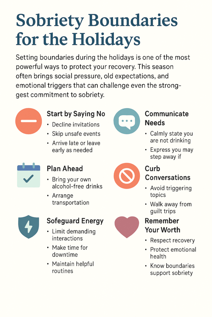 Getting through the holiday season while staying true to your goals doesn’t happen by accident. Having boundaries in place and responses ready to go is super important if you want to avoid relapse and actually enjoy yourself. Every boundary you set is a way of taking care of yourself, and the more you practice, the easier it will feel. Wishing you a steady, joyful, and peaceful holiday season!