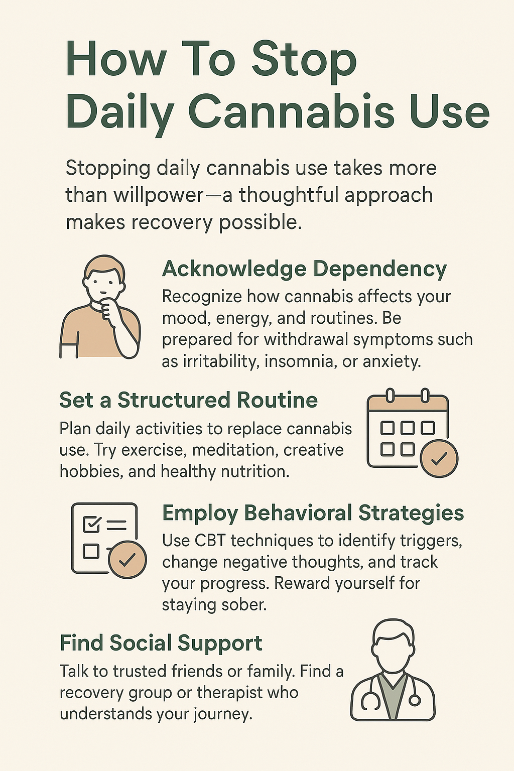 Daily cannabis use can become a habit that impacts your well-being. This guide offers practical steps to help you stop or reduce use with clear, manageable actions.