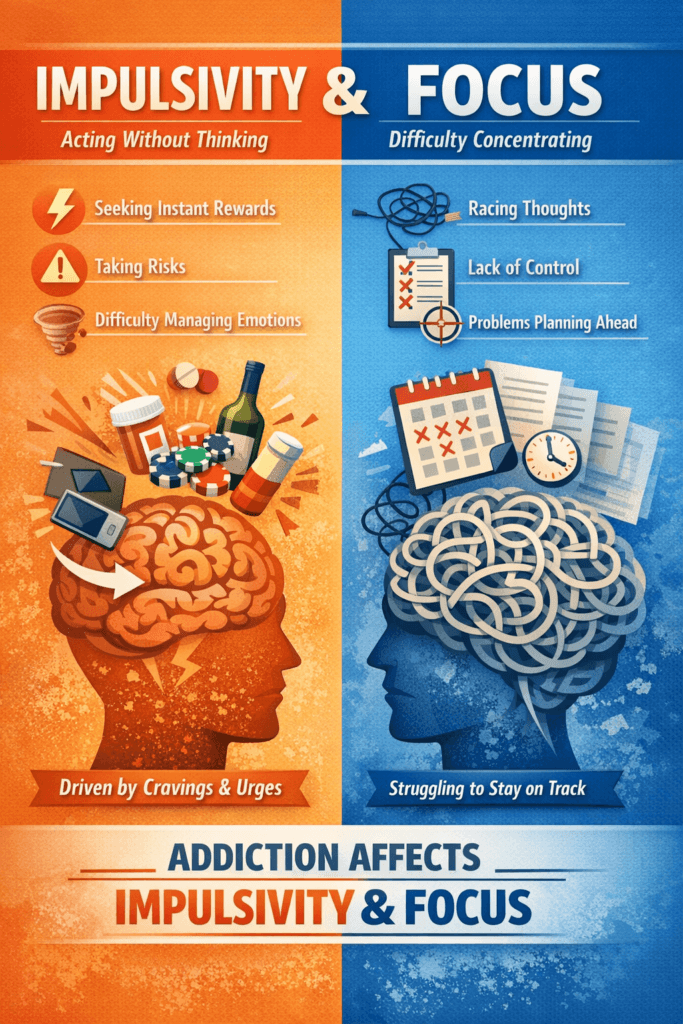 Impulsivity link: Addiction is fueled by impulsive decision-making—choosing the quick fix of drugs over long-term goals. Impulsivity is a strong predictor of relapse after treatment.