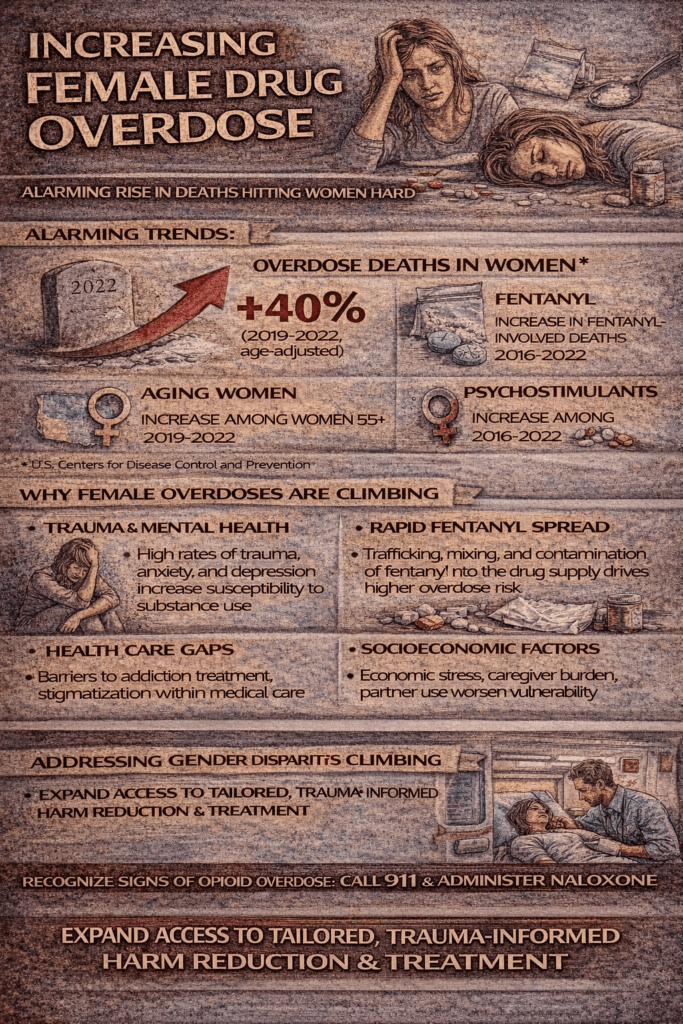 The rise in female overdose deaths is not the result of a single factor but a convergence of biological vulnerability, prescribing practices, trauma, stigma, shifting drug trends, and systemic barriers.