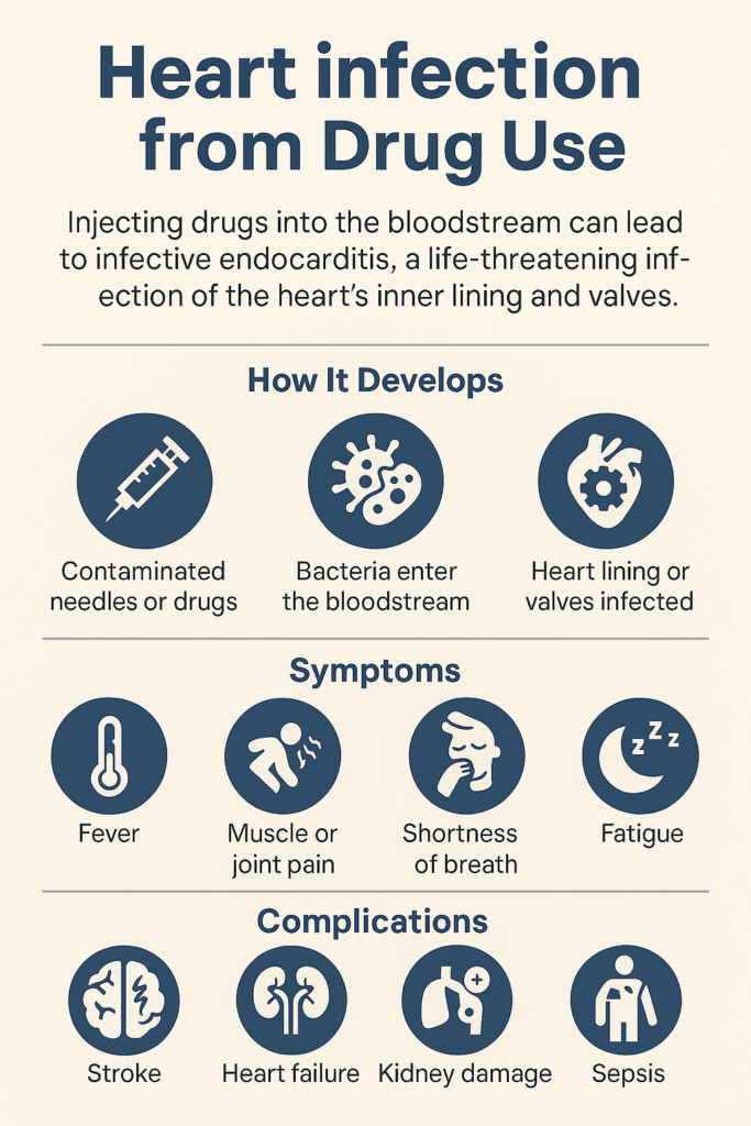 Other types of drug use (like snorting) don’t usually lead straight to heart infections, but drugs that affect the immune system, blood flow, or heart tissue can still increase the risk of other heart-related problems. Injecting drugs is by far the main pathway for bacteria to hitch a ride to your heart.