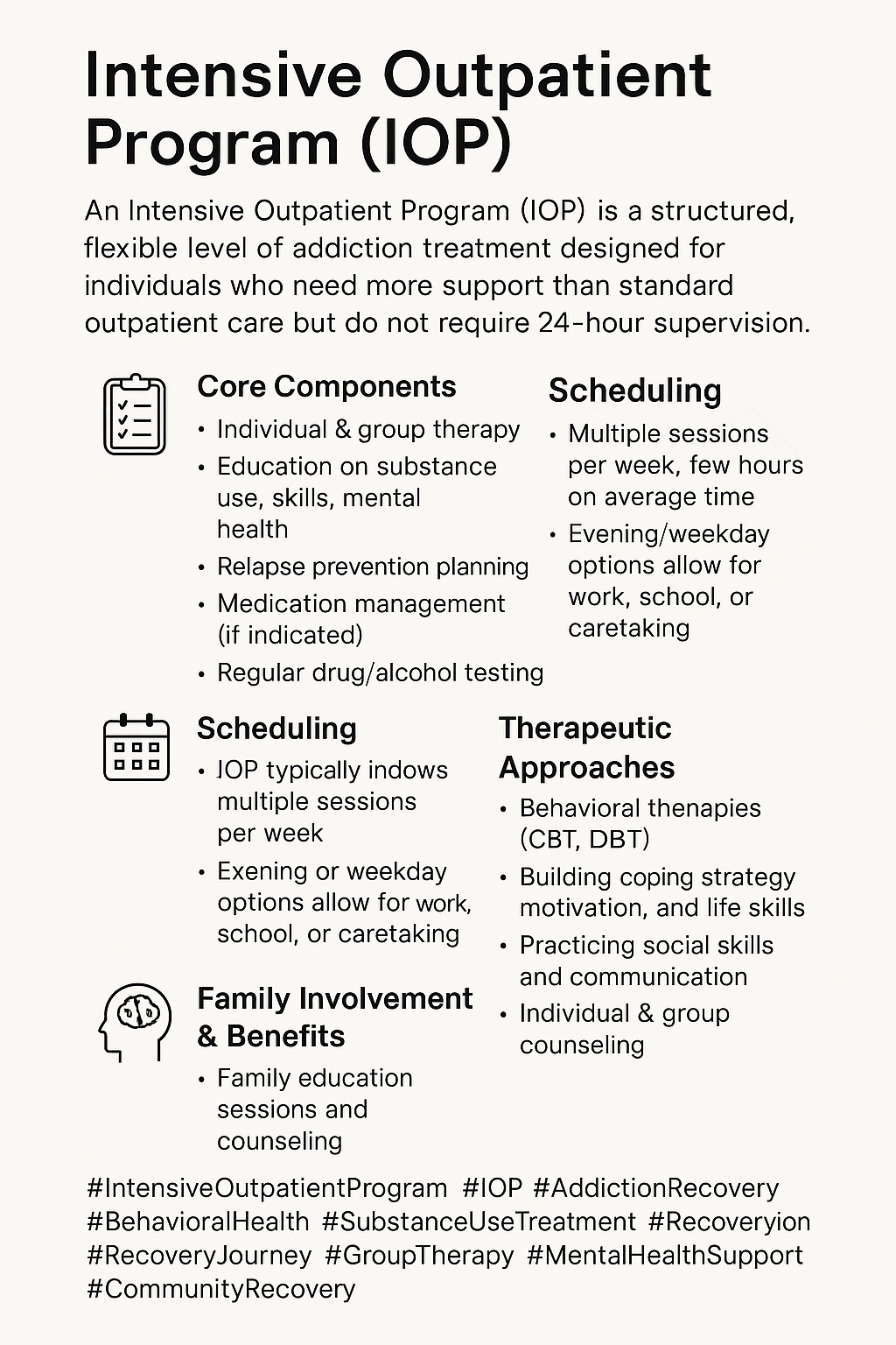 Intensive Outpatient Programs are an adaptable, supportive, and effective treatment option for individuals facing addiction. By combining comprehensive care with the ability to maintain daily responsibilities, IOPs offer a valuable pathway to recovery, equipping participants with the skills and confidence to achieve long-term sobriety.