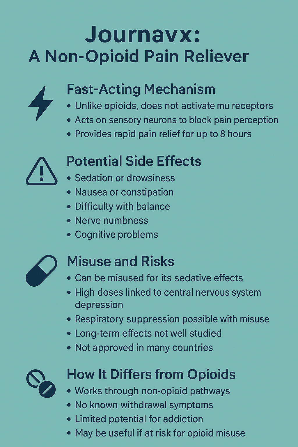 Disadvantage: While Journavx offers an alternative to opioids, relying solely on it for pain management without addressing the underlying causes of pain or incorporating other therapeutic strategies (such as physical therapy, lifestyle changes, or complementary treatments) could limit overall recovery or pain management effectiveness.