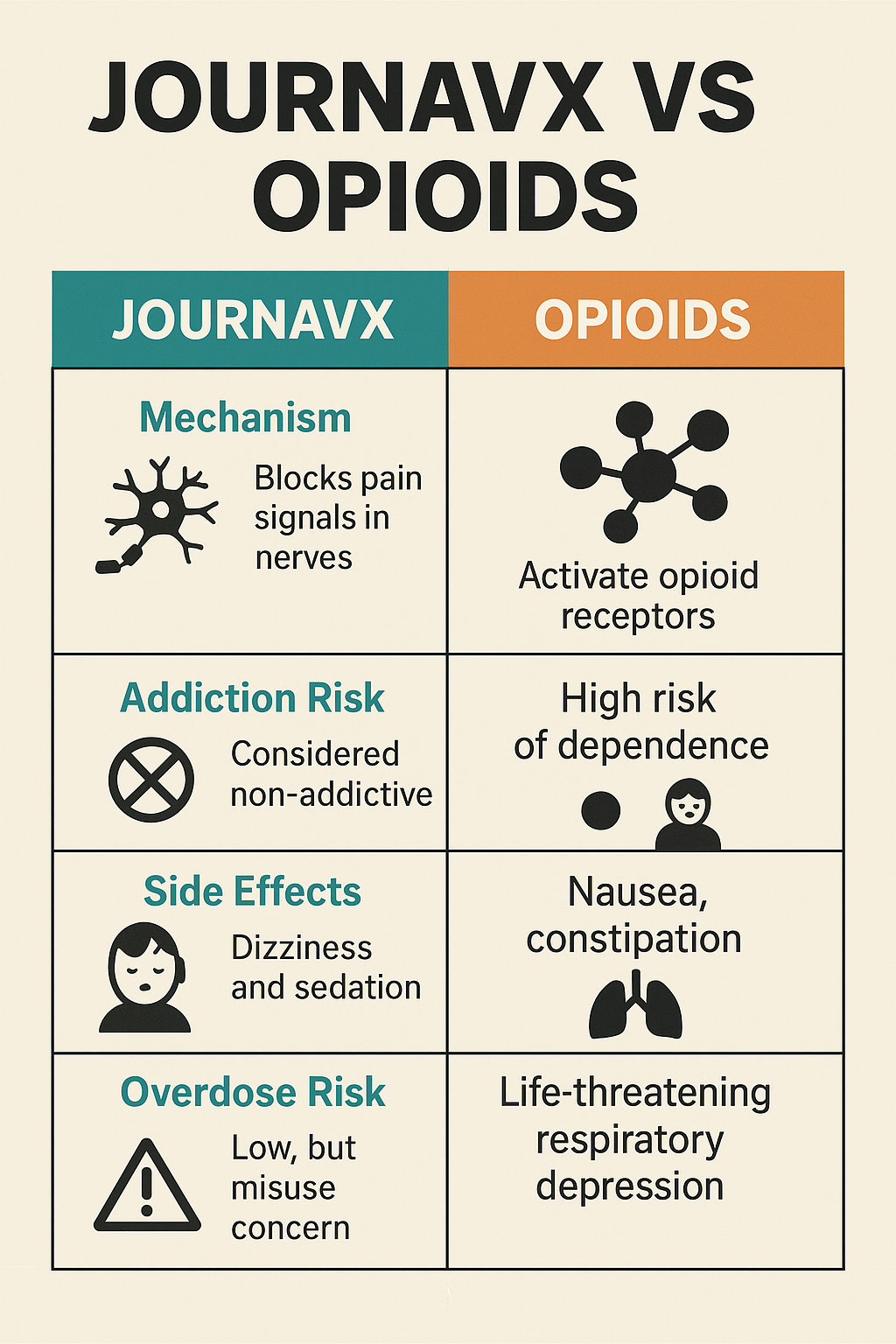 Advantage: Because it is non-addictive and has a safer side-effect profile, Journavx may be a better option for individuals who need long-term pain management but want to avoid the risks associated with chronic opioid use.