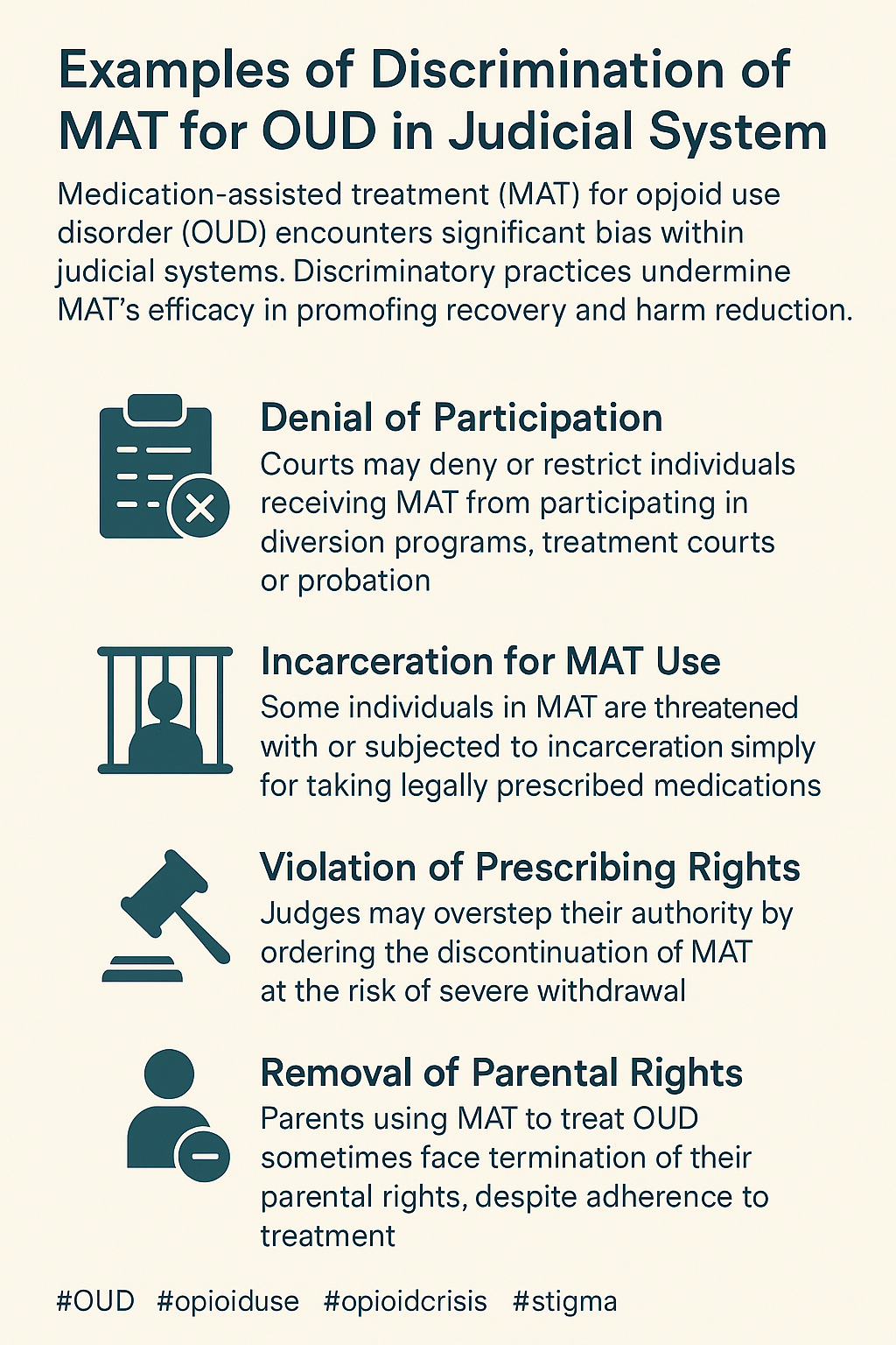 - Despite being recognized as the gold standard for OUD treatment, MAT is still perceived by some as “trading one addiction for another.” This outdated mindset contributes to discrimination against individuals on MAT, influencing decisions in sentencing, probation, and even child custody cases.