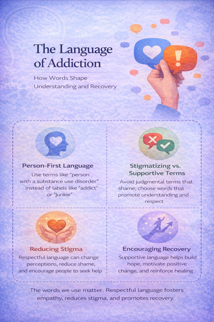 Language shapes how addiction is understood by families, communities, and healthcare systems. When addiction is discussed using respectful and accurate terms, it becomes easier to recognize it as a health condition that requires support and treatment rather than judgment.