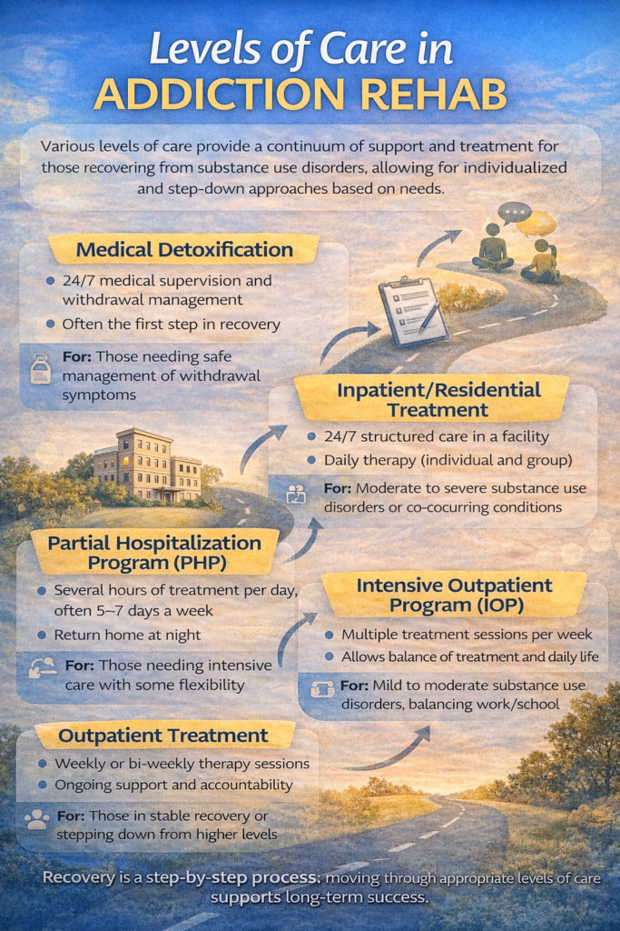 Addiction recovery is not a one-size-fits-all journey. Different individuals require different types and intensities of care depending on their substance use, mental health needs, and life circumstances. That’s where levels of care in addiction rehab come in—a structured system designed to provide the right support at the right time.