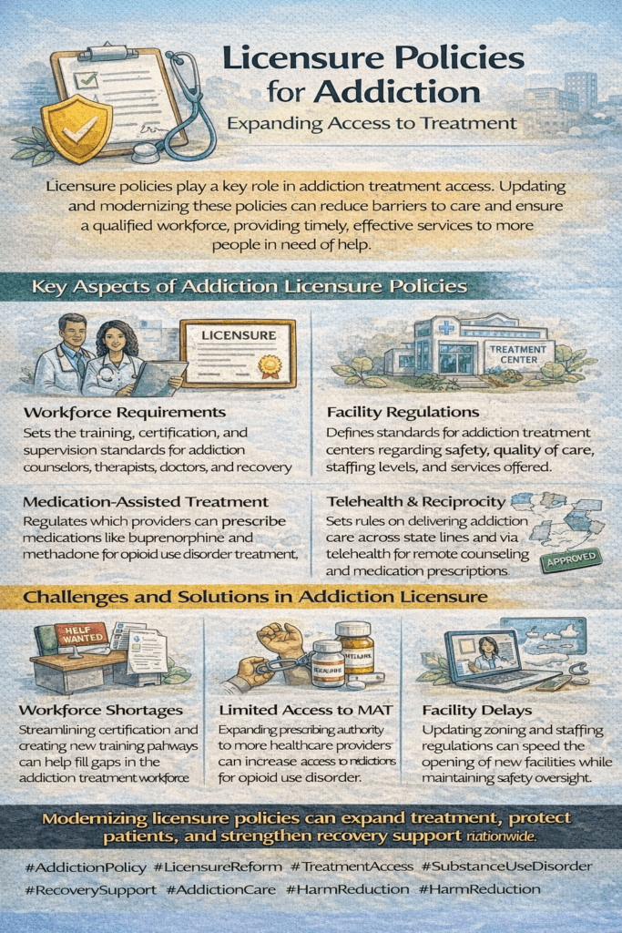 Licensure policies are critical components of the healthcare landscape, especially in the context of treating opioid use disorder (OUD). These regulations define who can provide treatment and influence how and where care is delivered. By understanding how licensure policies can facilitate access to OUD medications, we can identify opportunities to improve treatment for individuals affected by opioid addiction. Here are several key ways in which these policies play a pivotal role: