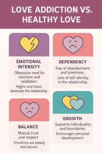 Love addiction is a common term, but it describes a pattern in which the need for romantic connection starts controlling one’s actions and thoughts. On the other hand, healthy love grows from mutual respect, understanding, and freedom. Knowing what separates these experiences is really important for self-growth and healthier relationships.