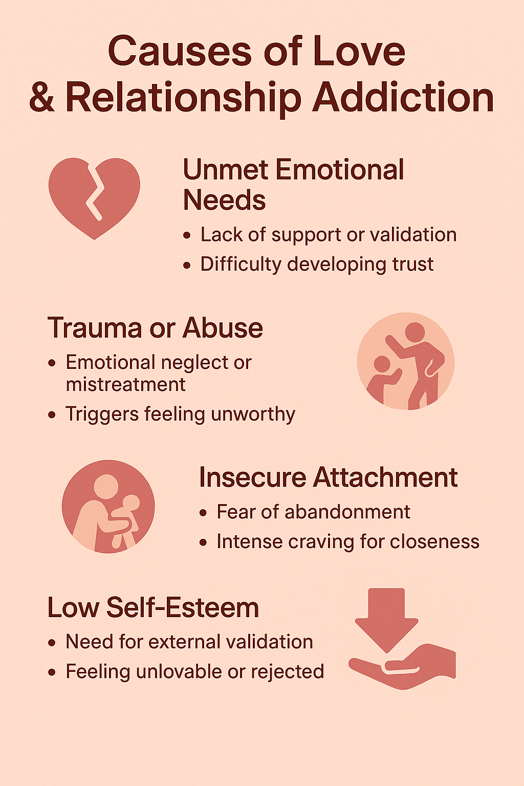 Love addiction is sometimes linked to unresolved childhood trauma, attachment issues, or low self-esteem. Many individuals who struggle with love addiction may have experienced emotional neglect, inconsistent caregiving, or abandonment in early life, leading them to develop an intense fear of rejection and loneliness.
