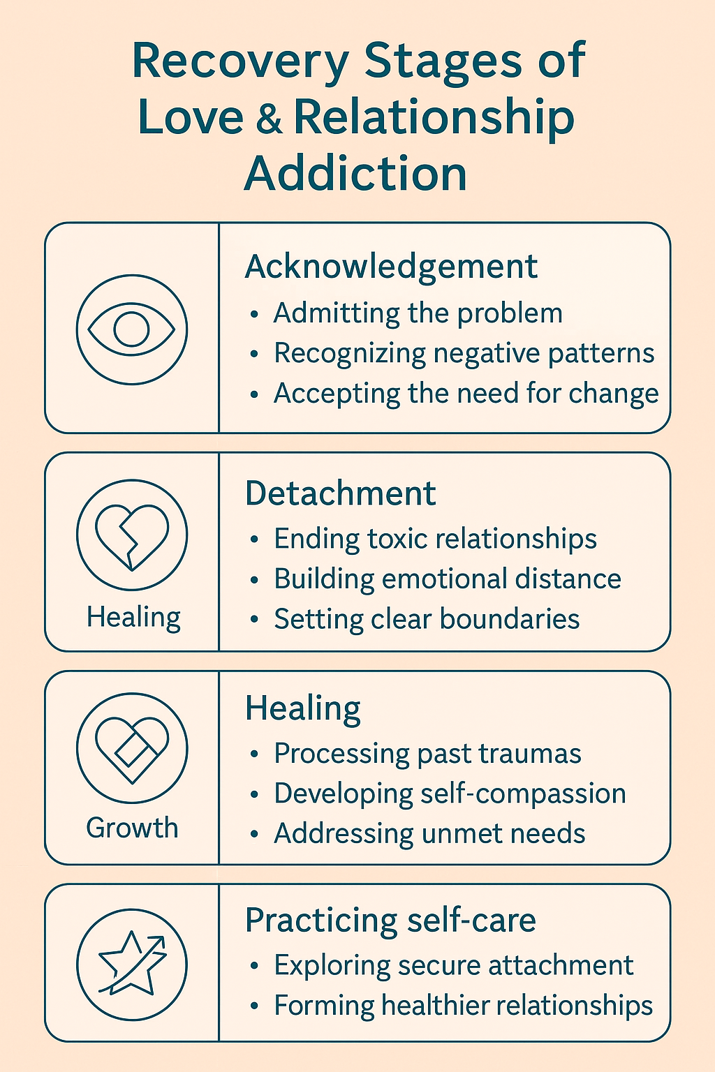 - The first step toward recovery is recognizing the patterns and admitting that love addiction is interfering with personal well-being.