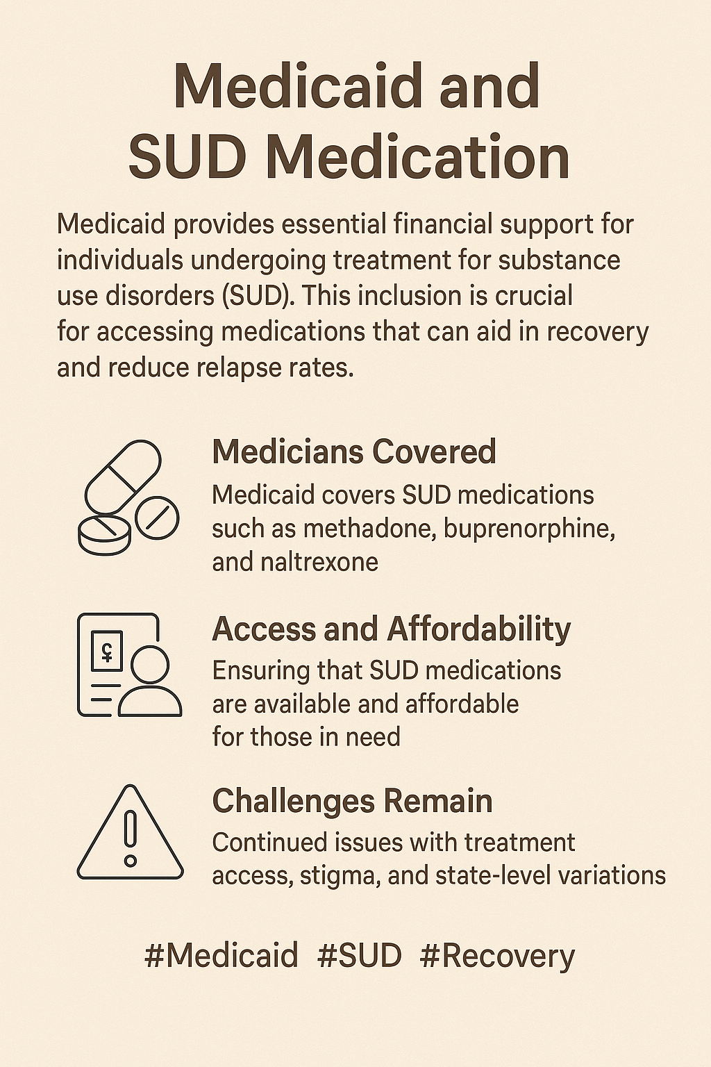 - Medicaid ensures access to essential medications, particularly for low-income individuals. Treatments like Medication-Assisted Treatment (MAT) manage withdrawal, reduce cravings, and prevent relapse, offering vital support for those in recovery.