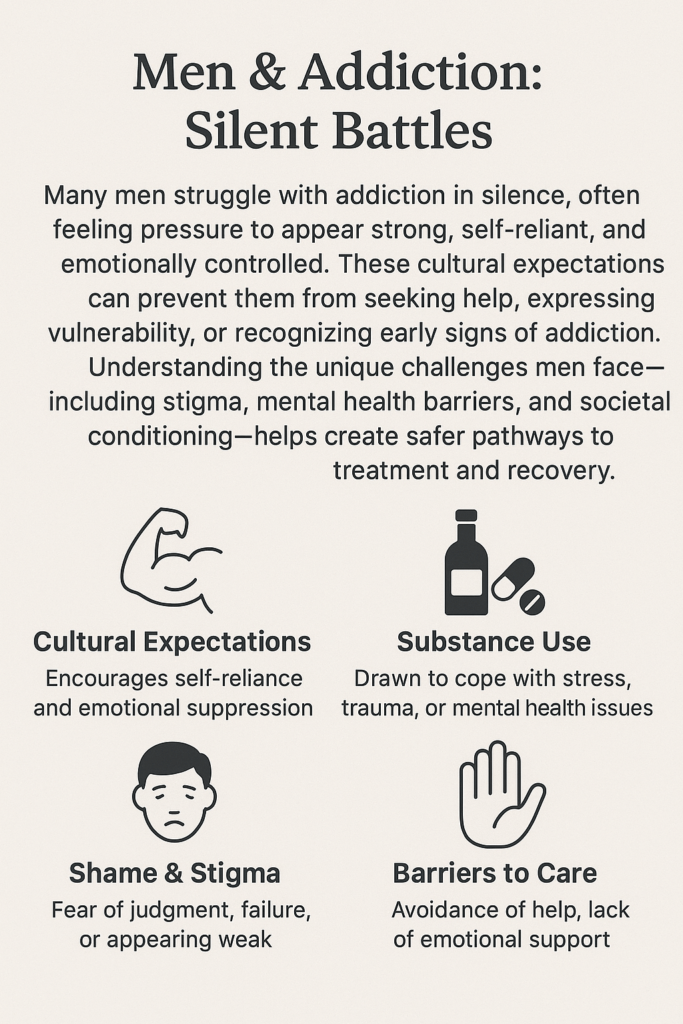 Men often face a double layer of challenges, not only dealing with the addiction itself, but also with stigma and personal expectations. The idea that men shouldn’t openly talk about weakness or emotional pain makes reaching out pretty daunting.