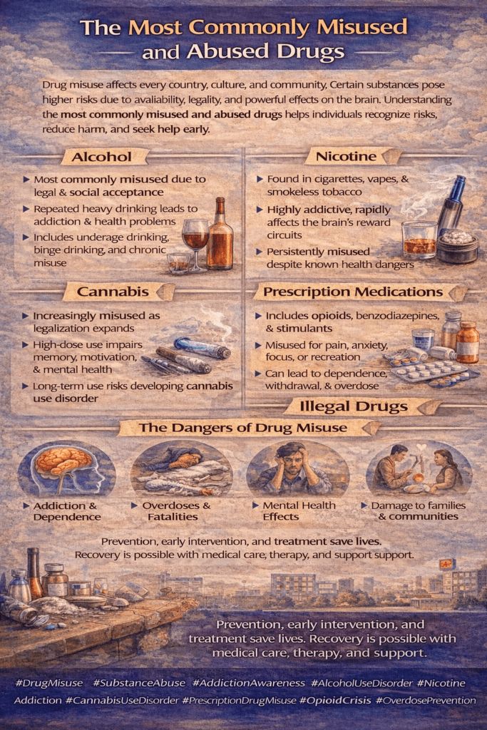 The misuse and abuse of drugs remain significant public health challenges worldwide, affecting individuals across all ages, cultures, and socioeconomic backgrounds. Substances such as alcohol, prescription medications, cannabis, stimulants, and sedatives are among the most commonly misused and abused due to their availability, social acceptance, or perceived safety. While some of these substances are legal or medically prescribed, misuse can still lead to serious physical, psychological, and social consequences. Understanding which drugs are most commonly misused—and why—helps highlight the need for prevention, education, and early intervention at both individual and community levels.