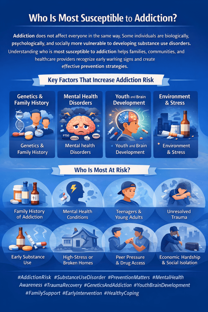Addiction vulnerability is not a personal weakness—it is the result of intersecting risk factors. By recognizing who is most susceptible, communities and healthcare systems can focus on prevention, early support, and targeted interventions that reduce harm and improve long-term outcomes.