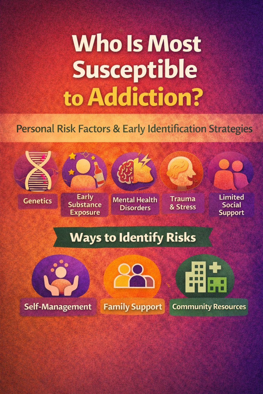 Addiction does not develop in isolation, nor does it affect all individuals equally. Research shows that people with genetic vulnerability, early exposure to substances, untreated mental health conditions, trauma histories, chronic stress, and limited social support are most susceptible to developing addiction. Identifying these risk factors early is critical for prevention and long-term health. Effective identification requires a multi-level approach that includes self-management strategies such as self-awareness and coping skills, family support through education and open communication, and community resources that provide screening, education, and mental health services. When these systems work together, risk factors can be recognized before addiction takes hold, shifting the focus from crisis response to proactive prevention and early intervention.