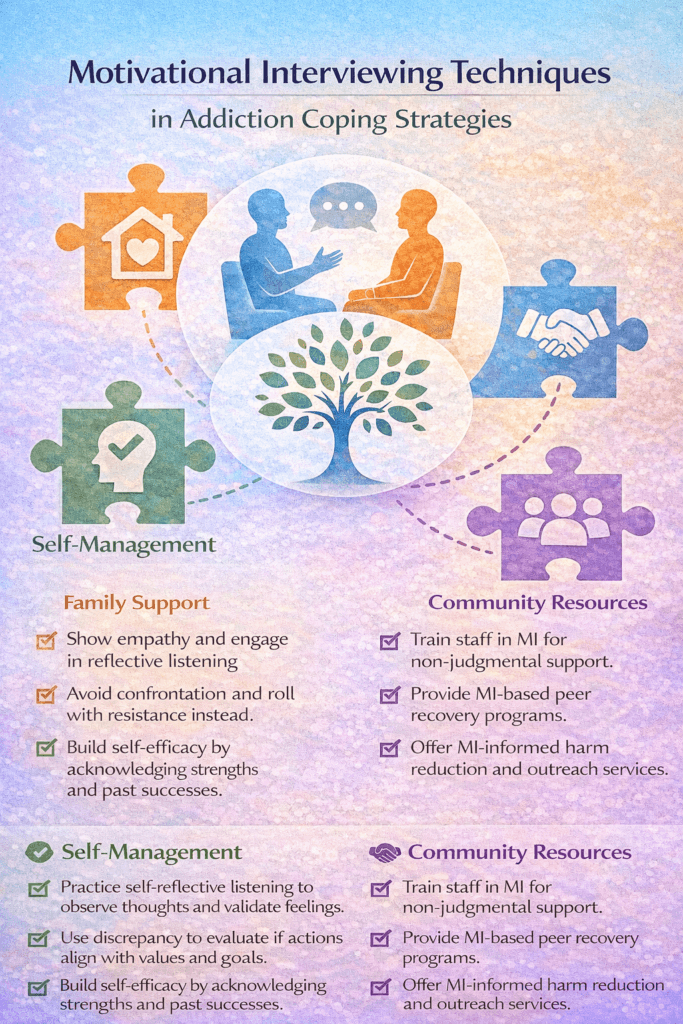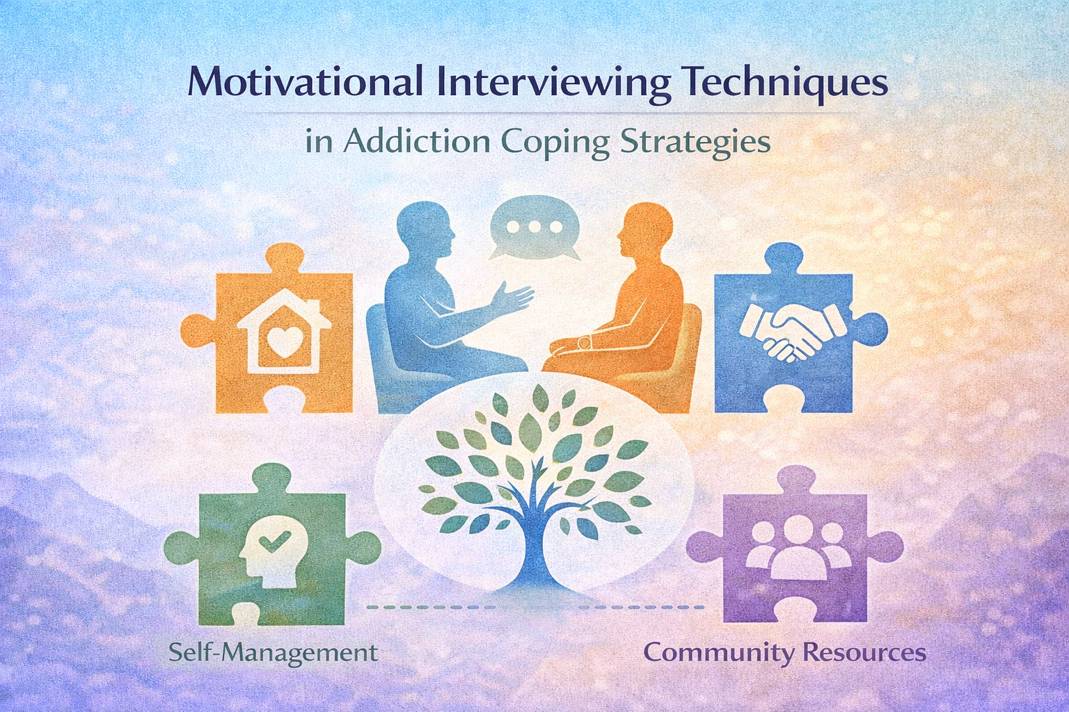 Motivational Interviewing (MI) techniques play a vital role in addiction coping strategies by helping individuals navigate ambivalence, strengthen motivation, and build confidence for change. Rather than relying on confrontation or pressure, MI emphasizes empathy, collaboration, and respect for autonomy. When applied across self-management, family support, and community resource strategies, motivational interviewing creates a consistent, supportive environment that enhances emotional regulation, reduces resistance, and encourages healthier coping responses during recovery.