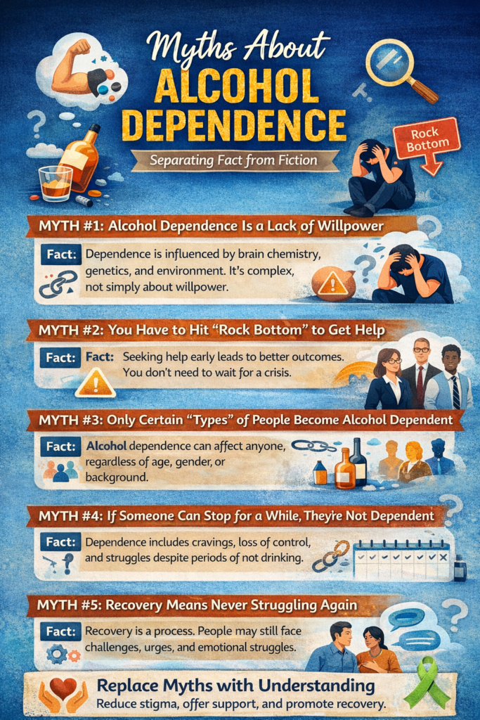 One of the most common myths is that people with alcohol dependence simply lack discipline or self-control. In reality, alcohol dependence is a complex condition influenced by brain chemistry, genetics, environment, and psychological factors.
