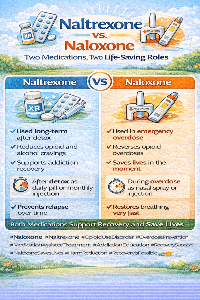 Naloxone saves lives during overdoses. Naltrexone helps prevent relapse and supports long-term recovery.