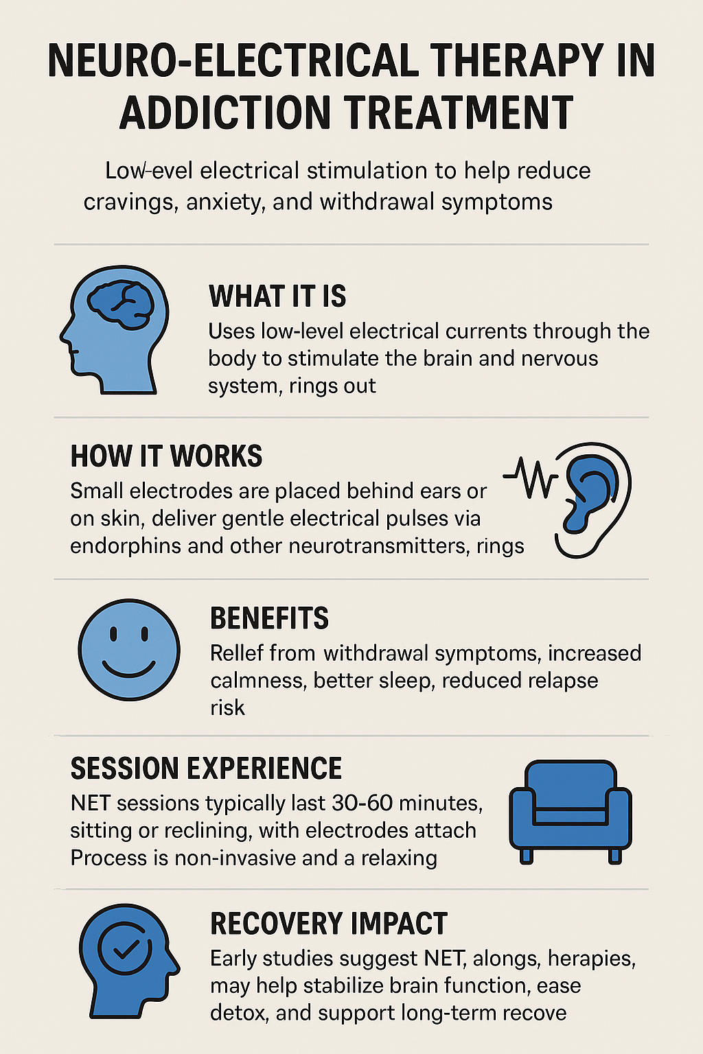 Neuro-electric therapy can be effectively integrated with traditional addiction treatments, such as cognitive-behavioral therapy (CBT), medication-assisted treatment (MAT), and counseling. This multimodal approach enhances treatment outcomes by addressing both the psychological and neurological aspects of addiction.