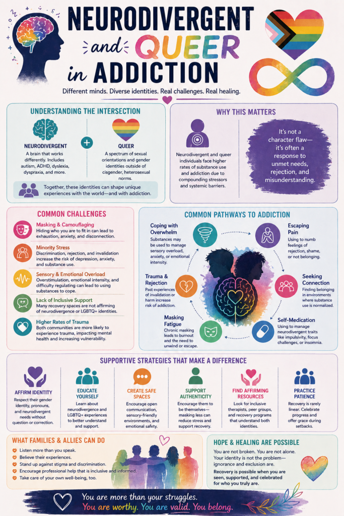 Addiction is rarely shaped by a single factor—it is influenced by identity, environment, and lived experience. For individuals who are both neurodivergent and queer, addiction often exists within a unique intersection of cognitive differences and identity-based stress. Navigating a world that may not fully understand or accommodate either identity can lead to challenges such as masking, social exclusion, and emotional overwhelm. In this context, substance use or addictive behaviors may develop not as a flaw, but as a way of coping with unmet needs, pressure, or disconnection. Understanding this intersection is essential for creating more inclusive, compassionate approaches to both awareness and recovery.
