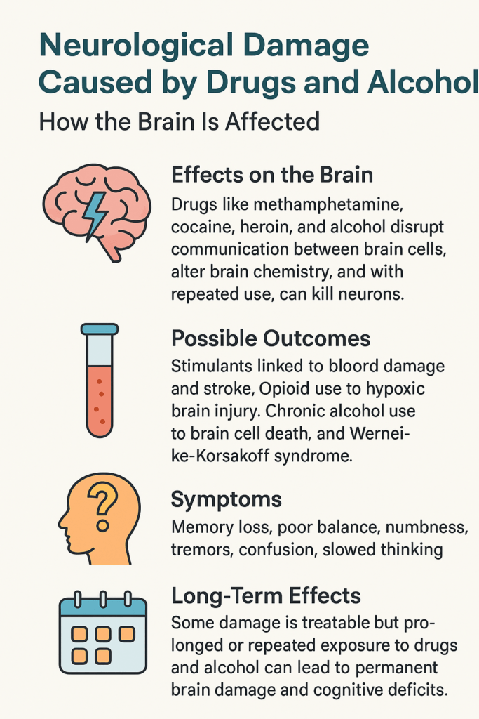 Neurological damage occurs when parts of your nervous system, mainly your brain and the nerves running through your body, are harmed or don’t work as they should. This can mess up movement, memory, mood, and decision-making. Drugs and alcohol can damage nerve cells, disrupt chemical signals, and even shrink or change certain regions of the brain.