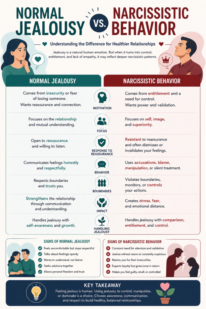 Recognizing the difference between normal jealousy and narcissistic behavior allows for healthier, more balanced relationships. While normal jealousy can be managed through communication, reassurance, and self-awareness, narcissistic patterns often require stronger boundaries and deeper reflection. Understanding these distinctions helps individuals respond more effectively, avoid normalizing harmful behaviors, and foster relationships built on mutual respect rather than control. Ultimately, awareness is the key to navigating emotional reactions in ways that support both personal well-being and healthy connections.