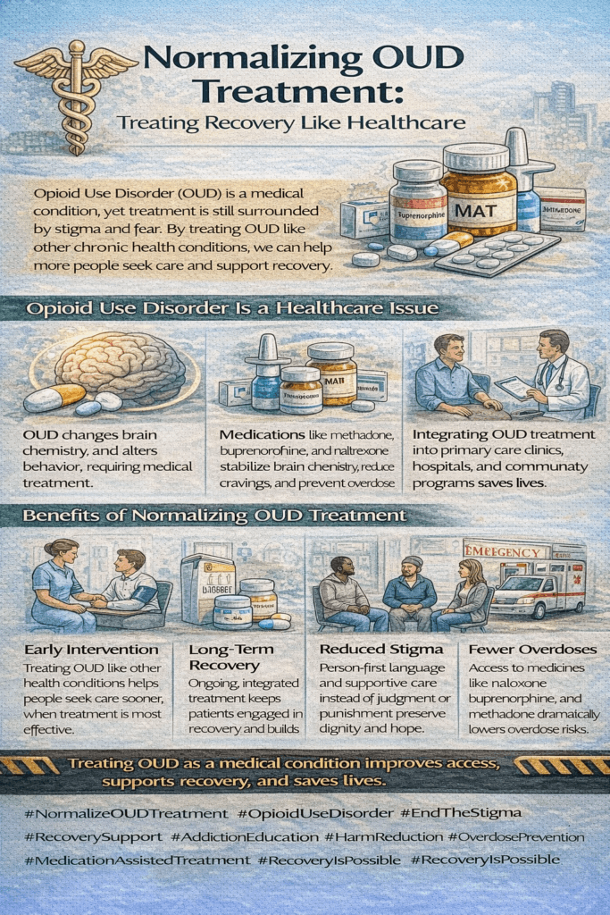 It means treating Opioid Use Disorder like any other medical condition and viewing recovery care as standard healthcare rather than a moral issue.