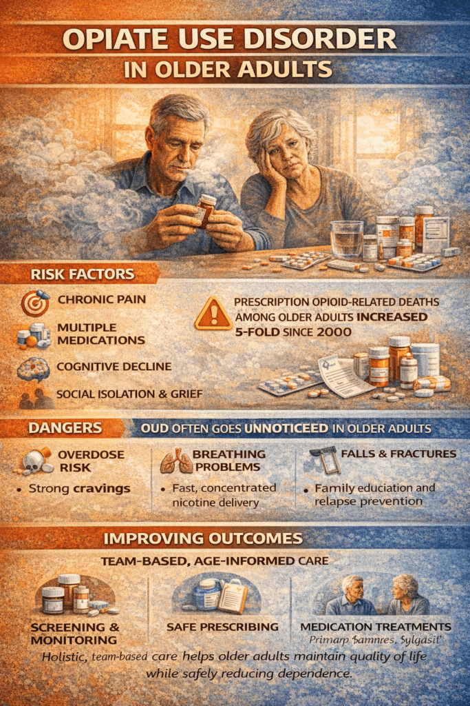 Opioid Use Disorder (OUD) in older adults is a growing concern, driven by chronic pain, multiple prescriptions, age-related changes, and social isolation. Prevention requires a comprehensive approach: self-management through safe medication use, health check-ups, and non-opioid pain care; family support through open communication, prescription monitoring, and healthy routines; and community resources such as wellness programs, caregiver education, and counseling to keep older adults safe and supported.