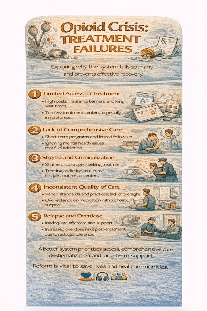 Many communities lack affordable treatment centers, medication-assisted treatment providers, or transportation. Long waitlists and insurance limitations delay care when it is most needed.
