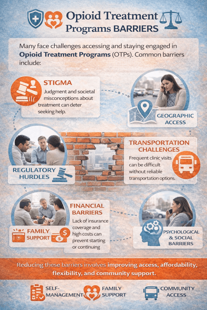 Overcoming barriers to Opioid Treatment Programs is most effective when self-management, family support, and community resources work together. Individuals who proactively plan appointments, regulate stress, communicate openly with providers, and build recovery routines strengthen their ability to remain engaged in care. Families who provide practical assistance, education, encouragement, and structured accountability reduce logistical and emotional obstacles. Communities that expand access through telehealth, transportation services, integrated care models, financial assistance, and stigma-reduction efforts create an environment where treatment becomes accessible rather than burdensome. When these layers align, barriers become manageable challenges—and recovery becomes a realistic, sustainable path forward.