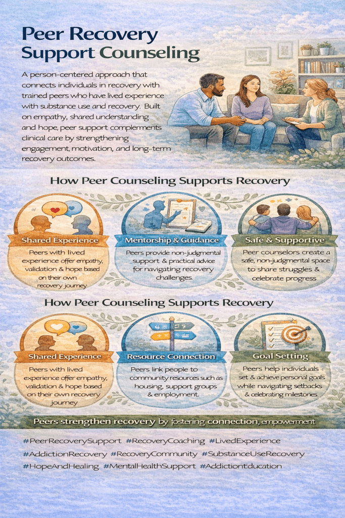 Peer support is non-clinical and relationship-based. Peer counselors do not diagnose or provide therapy; instead, they offer encouragement, mentorship, and real-world recovery support alongside clinical care.