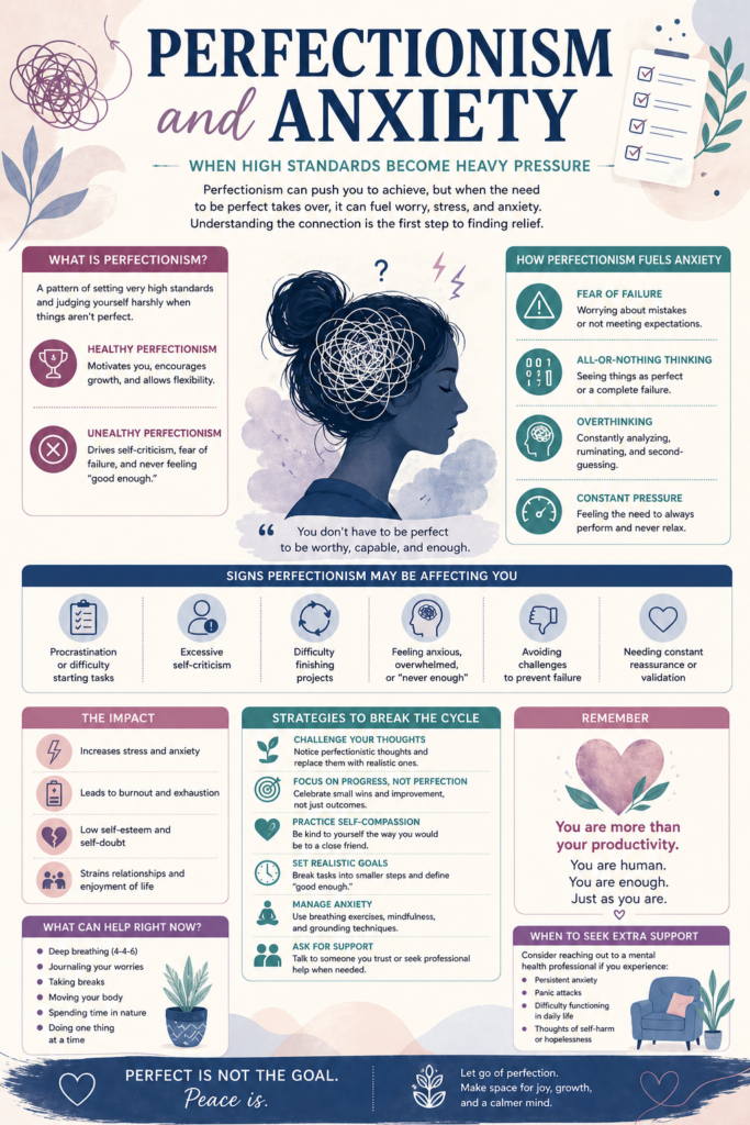 Perfectionism and anxiety are closely linked patterns that can significantly impact how individuals think, feel, and function in daily life. While striving for high standards can be motivating, perfectionism often goes beyond healthy ambition and becomes driven by fear of failure, self-criticism, and the need for control. This creates a constant internal pressure to meet unrealistic expectations, which in turn fuels anxiety. Understanding how perfectionism contributes to anxious thoughts and behaviors is essential for recognizing why even small tasks or mistakes can feel overwhelming.