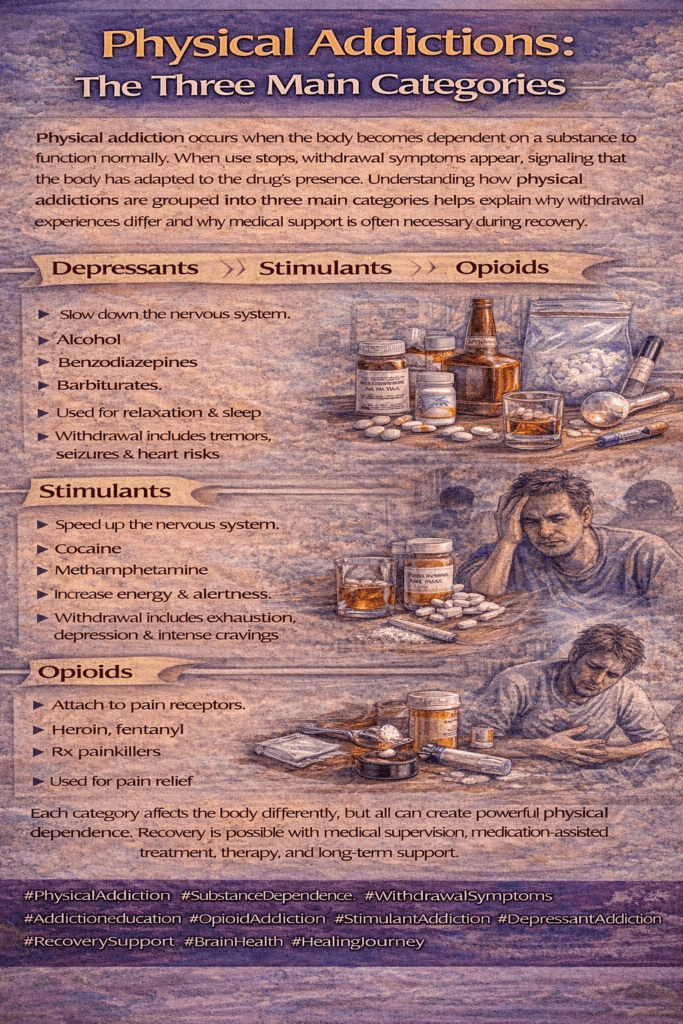 Recognizing the three main categories of physical addictions provides a clearer framework for prevention, early intervention, and treatment. While depressants, stimulants, and nicotine-based substances impact the body differently, all can disrupt normal functioning and lead to serious health consequences if left unaddressed. Effective responses require awareness, supportive environments, and access to medical and behavioral care. By approaching physical addiction through education, compassion, and coordinated support, individuals, families, and communities can reduce risk and promote long-term health and recovery.