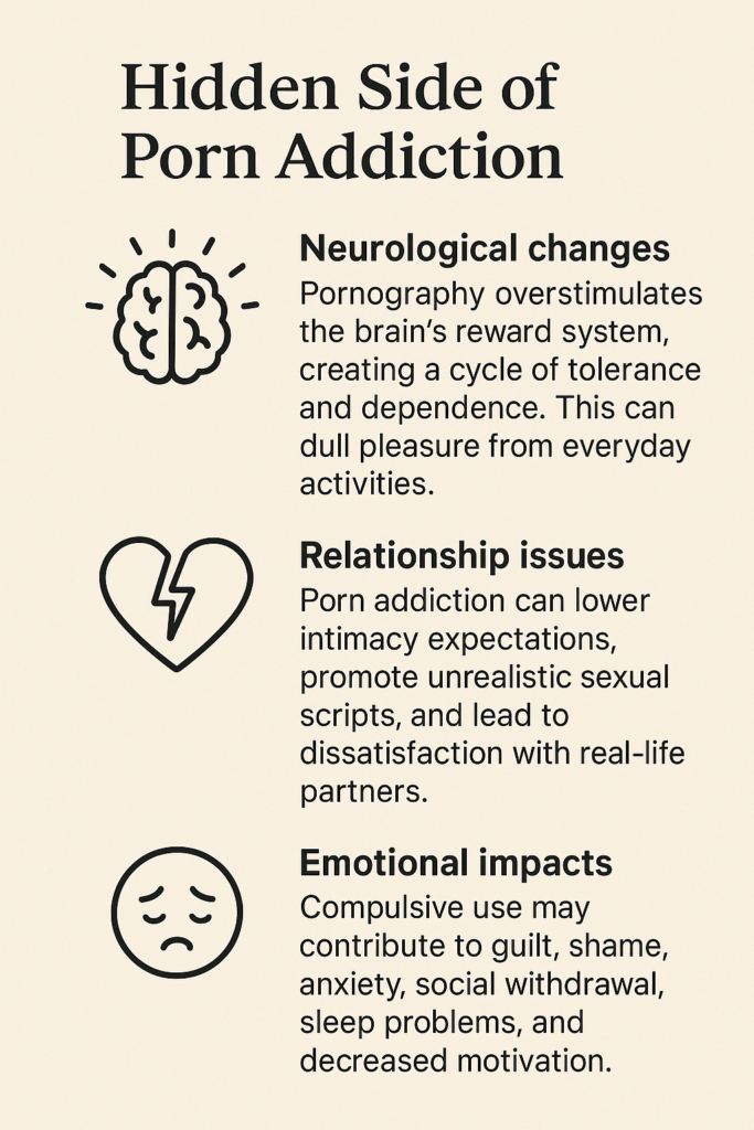 - Impacts on Sexual Function: Some notice trouble getting aroused or experiencing pleasure with real-life partners, a problem sometimes called porn induced erectile dysfunction.