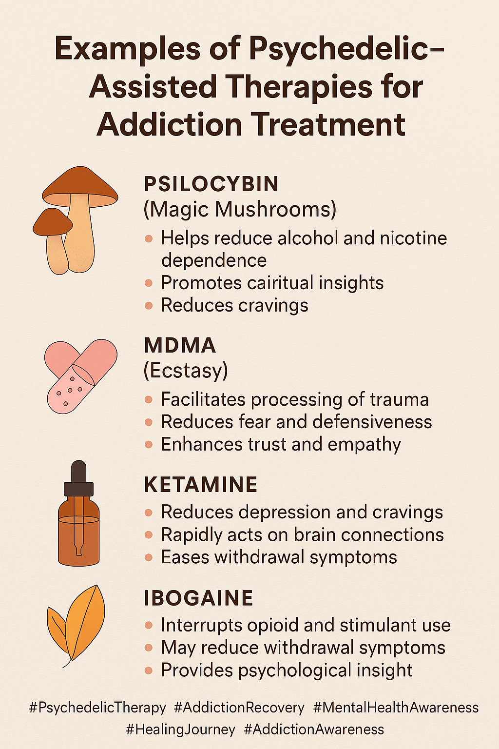 Psychedelic-assisted therapies for addiction treatment involve the controlled administration of specific substances in therapeutic settings, paired with psychotherapy to address the root causes of addiction. Below are some well-known examples: