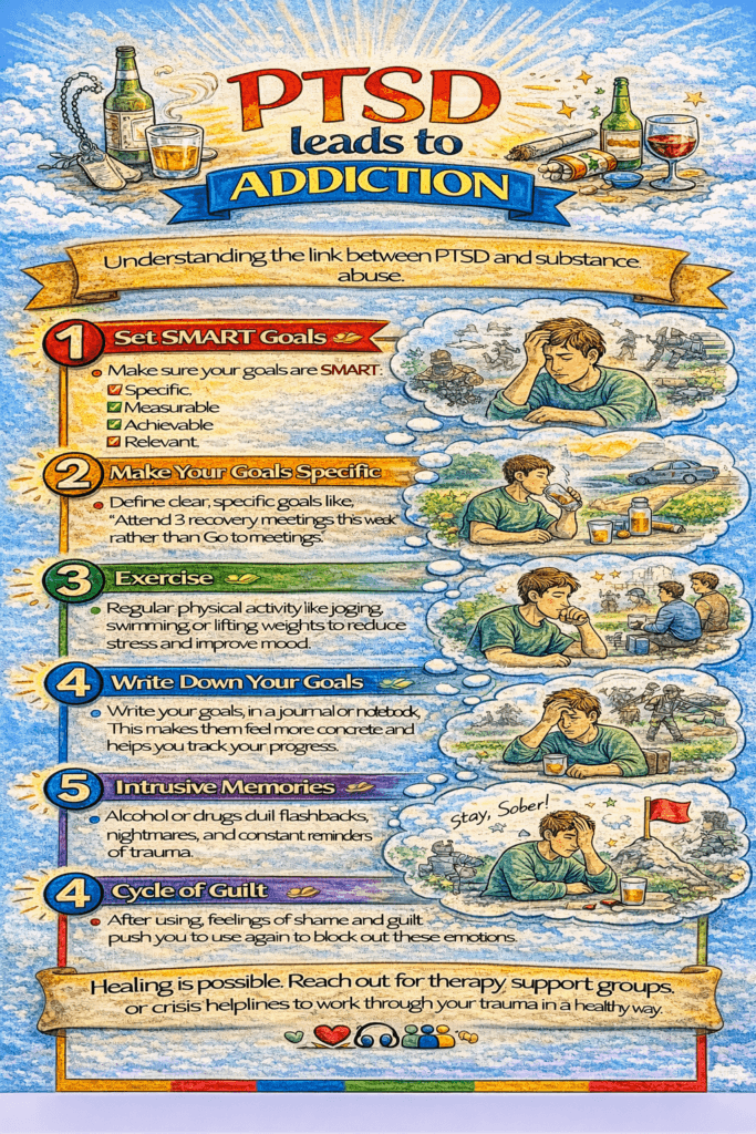 PTSD and addiction frequently co-occur because individuals may use substances to cope with overwhelming symptoms such as anxiety, insomnia, flashbacks, or emotional pain. This pattern is known as self-medication.