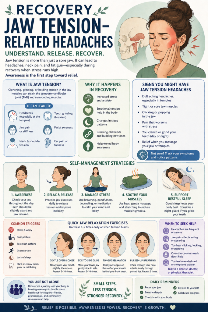 Headaches during recovery can feel unpredictable—especially when they don’t seem tied to obvious triggers. One of the most overlooked causes is jaw tension, a physical response to stress that often goes unnoticed. Clenching your jaw, grinding your teeth, or holding subtle facial tension throughout the day can gradually build into persistent headaches.