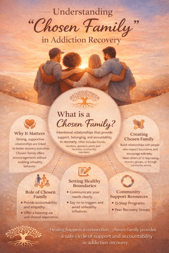 Addiction recovery is rarely sustained in isolation. While biological family relationships can be powerful sources of support, they may also be complicated by trauma, strained trust, or unhealthy dynamics. In this context, the concept of “chosen family” has become increasingly meaningful in recovery communities. A chosen family refers to supportive relationships that individuals intentionally build—friends, mentors, sponsors, peers, faith leaders, or recovery community members—who provide encouragement, accountability, and a sense of belonging.