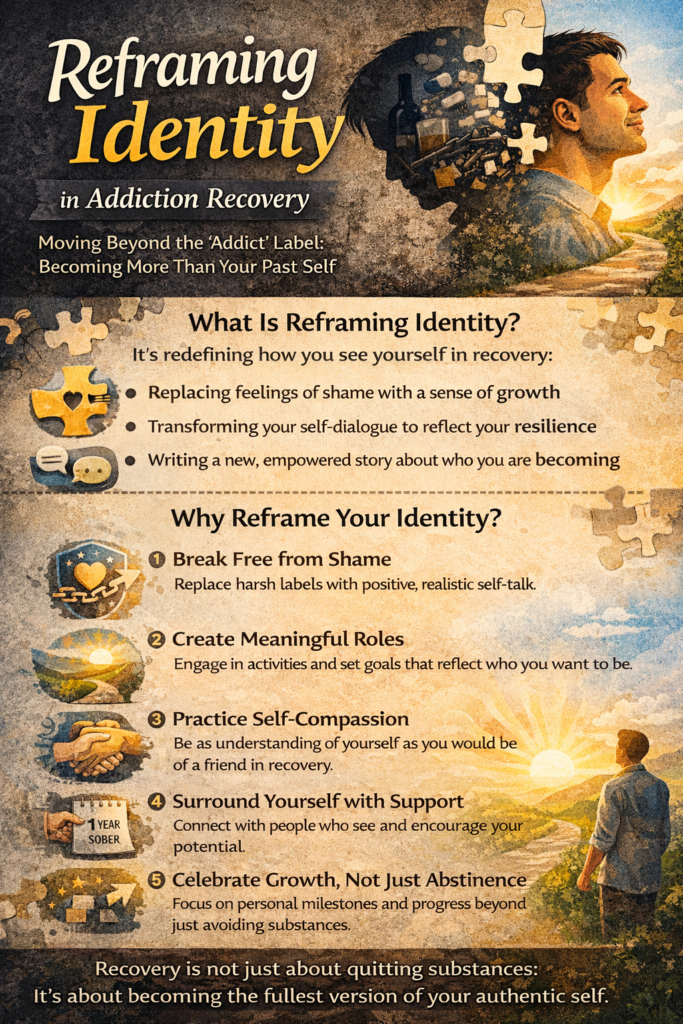 Reframing identity in addiction recovery is not a one-time realization but an ongoing process of transformation. It requires consistent effort, self-awareness, and support from both internal and external sources. By shifting away from limiting labels and embracing a more dynamic and compassionate view of self, individuals can build an identity rooted in growth rather than past behavior. This transformation strengthens long-term recovery by fostering purpose, confidence, and resilience. Ultimately, recovery is not just about leaving addiction behind—it is about becoming someone new, someone defined not by their struggles, but by their capacity to change, adapt, and move forward.