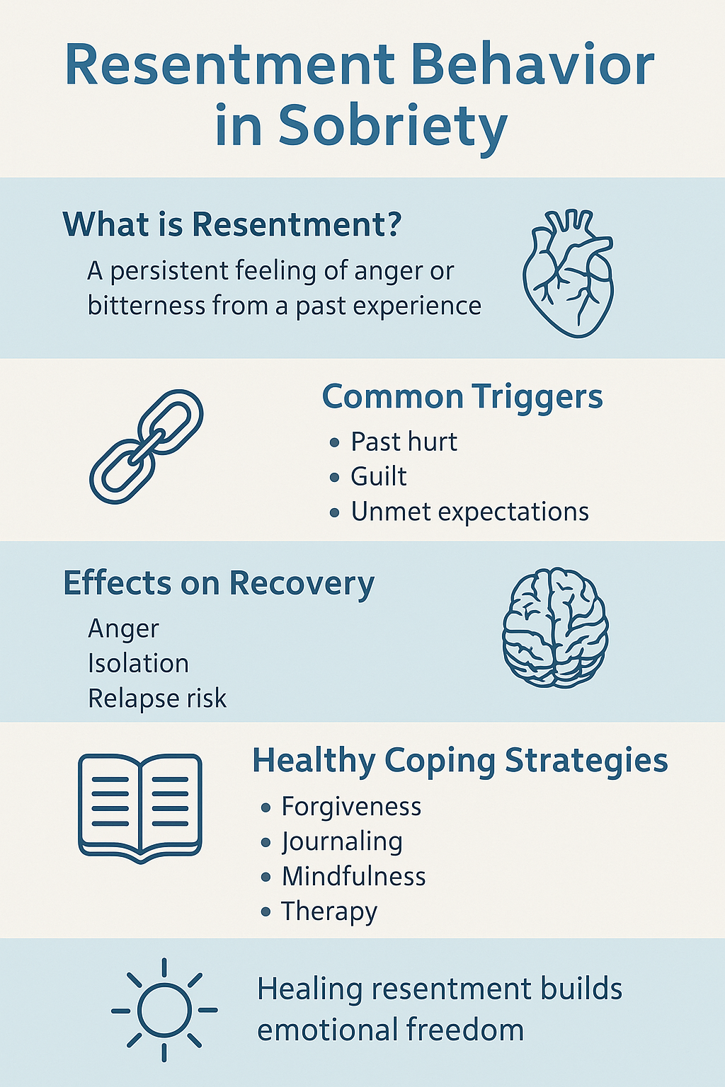 Resentment is a natural but manageable emotion in recovery. By practicing self-awareness, forgiveness, cognitive reframing, and healthy coping strategies, individuals can free themselves from the weight of resentment. Healing takes time, but with effort and support, it is possible to replace resentment with peace, gratitude, and lasting sobriety.