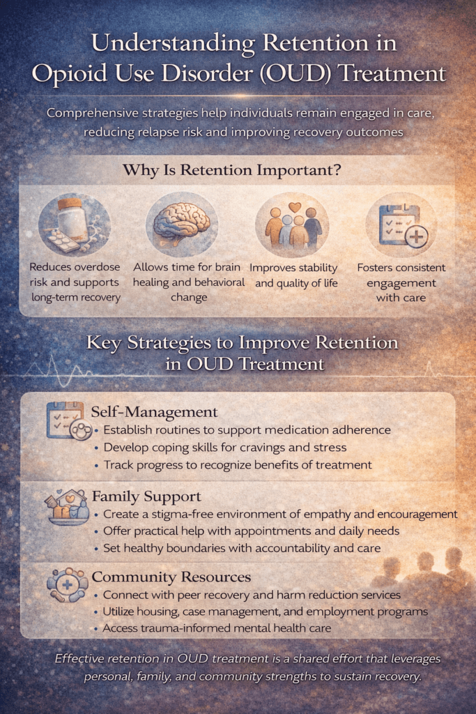 Retention in opioid use disorder (OUD) treatment is one of the most critical factors influencing survival, stability, and long-term recovery. Remaining engaged in care—particularly in medication for opioid use disorder (MOUD)—significantly reduces overdose risk and supports brain and behavioral recovery over time. However, retention is often threatened by cravings, stigma, logistical barriers, co-occurring mental health conditions, and social instability. Improving retention requires more than clinical intervention alone; it depends on a coordinated approach that empowers individuals through self-management skills, strengthens family support systems, and leverages community resources to reduce barriers and sustain engagement in care.
