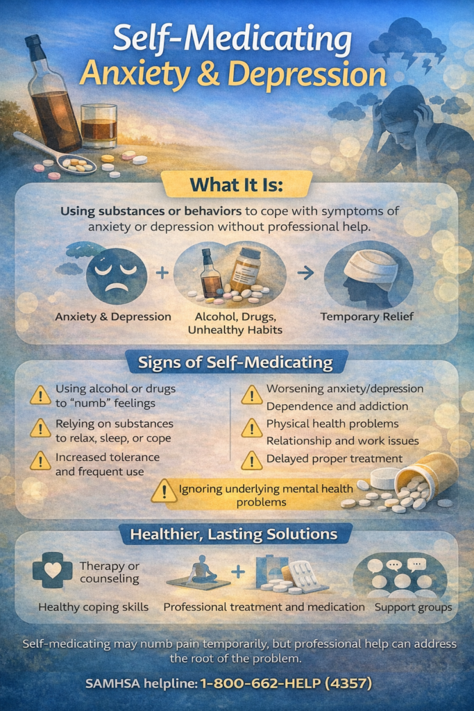 Self-medicating happens when someone uses substances like alcohol, drugs, or even certain behaviors (like gambling or overeating) to manage symptoms of anxiety or depression.