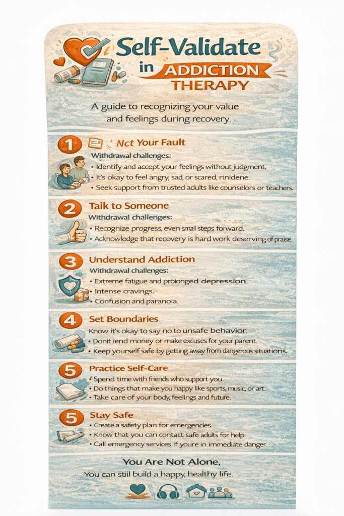 - Being Kind to Themselves: Feelings of guilt and shame often accompany addiction. Self-validation helps youths practice self-compassion, reframing recovery as a journey of learning and growth rather than one of perfection.