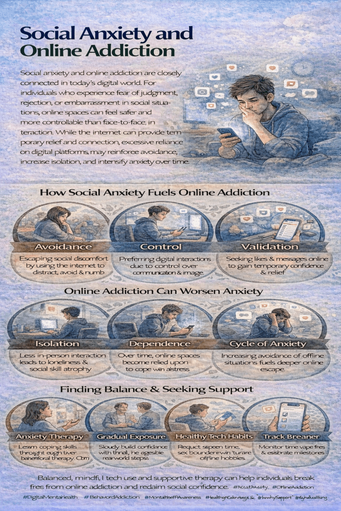 Social anxiety can make in-person interactions feel stressful or overwhelming. Online spaces often feel safer and more controllable, which can lead individuals to rely heavily on digital platforms for connection and relief, increasing the risk of online addiction.